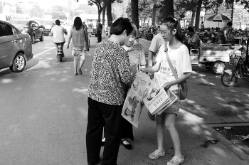 在新世纪广场附近的十字路口,刘明旸拿着一摞报纸大方地向路人推销。“开始不敢开口,后来鼓足勇气才发现也没那么难。”刘明旸告诉记者,刚开始时自己屡屡受挫,非常沮丧,但当第一份报纸卖出后,他信心倍增。不到9点,50份报纸就全部卖完了。