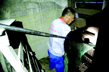 救助人员踩着凳子,爬到了通风道里。此时,小猫跑到了通风道底部。还好,小王带了猫粮,救助人员在通道底下撒上猫粮后,饥饿的小猫便过来吃东西了。救助人员将小猫装进网兜,救了出来。