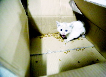 ◥市民把救出的小猫放进盒子中。 本报记者 韩逸 摄