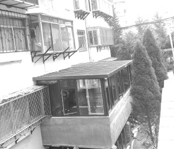 随后两名烟台市规划执法大队第一支队的工作人员到现场进行了检查。记者从一名工作人员那里了解到,他们是接到附近居民的投诉所以过来进行查看的。住户扩张阳台主要就是增加住宅面积,整个阳台面积在15平方米左右,但是事先并没有得到规划部门的许可,也没有进行申请,所以这位住户的外扩阳台就属于违章建筑。
