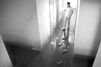 居民想要走进地下室必须在脚上套塑料袋,小心翼翼地踩着砖头通过。 本报记者 韩逸 摄