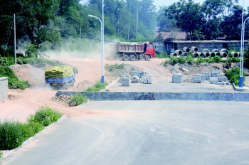 7月14日,由于岔河滨河东路东方红路与三八路之间尚未开通,不少经过的车辆从大堤上绕行,扬起阵阵沙尘。 本报记者 马志勇 摄
