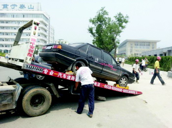 本报泰安7月14日讯(记者 曹剑) 14日上午8点左右,市中心医院东门附近,两辆私家车因为堵住人行道和妨碍施工车辆通行,被交警直接拖走。