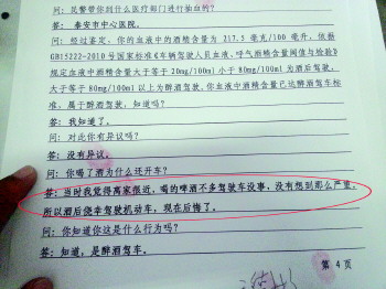 7月8日零时23分,泰安市交警二大队夜巡民警在东岳大街一线巡逻,行驶到科山路路口时,发现一辆猎豹越野车由北向南缓缓驶来。民警拦下之后发现,驾驶员满脸通红,车里有浓浓的酒味。民警让他呼吸式酒精测试仪检测,王某血液酒精含量为172mg/100ml,民警随即带领王某到泰安市中心医院检测,王某血液酒精含量为217.5mg/100ml,属于严重醉酒驾驶。