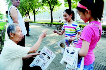 上午9时许,记者来到市人民公园,见到了高馨语和耿佳琪两位小报童,耿佳琪刚向一位在公园里乘凉的老先生卖出了一份报纸。老先生直夸耿佳琪和高馨语,人长得既漂亮又能干,“这俩姑娘,这么小就出来体验生活,懂得吃苦,真难得!”高馨语和耿佳琪互相配合,不到10时就把60份报纸都卖了出去。