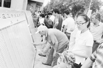 不少考生和家长在枣庄三中东校门前查看录取榜。 本报记者 杨霄 摄