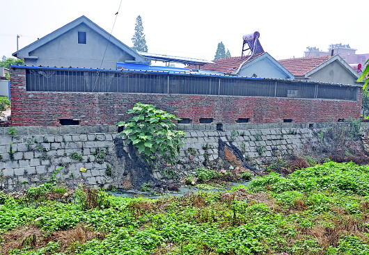 顺着护城河往南走,记者发现一家养殖户在河东岸盖的养殖棚,而在临近河岸的墙上有几处排粪口,养殖动物产生的粪便直接排进河中。在养殖场的南面,则是一家临河的饭店,在河岸上也露出了明显的排污口。