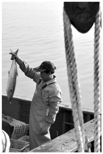 赤山渔港是中国北方最大的渔港,桅杆森森,塔吊高耸,海欧掠过。码头上深包着头巾的渔家妇人在织补鱼网,渔轮上水手在整理粗壮的缆绳,零乱、粗犷。忙碌的渔港与都市人平时的经历完全不同——归航渔轮一筐一筐地用磅秤称鱼,大声吆喝着,往卡车上扔整筐的马鲛鱼。而即将出航的渔船则忙着往鱼舱里装冰块,蔬菜和啤酒,年青的水手肩着背囊前来报到,老水手咬着香烟笑而不语。