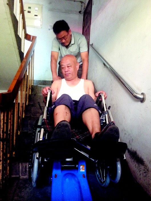 16日上午,十亩园社区居民王国栋老人坐在轮椅上,居委会工作人员一个人很轻松就可以用爬楼机将坐在轮椅上的他推上楼或者推下楼。爬楼过程中,爬楼机行动平稳,王国栋老人称丝毫没有颠簸感。一段8阶的楼梯爬楼机只用了不到十秒钟时间就爬了上去。