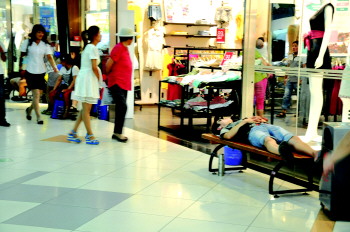 城区一卖场内,一位市民躺在公共长凳上呼呼大睡。 本报记者 公素云 摄