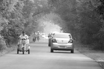 7月16日,不少私家车从禁止机动车通行的岔河大堤上疾驰而过,而附近就是新修的滨河大道,司机却为贪图方便与行人抢道。 本报记者 马志勇 摄