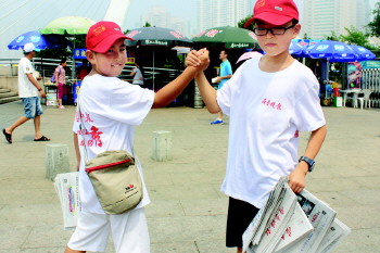 中午12点,很多小报童和家长去吃午饭了,而小报童穆赛和付怡萍两位小报童还在奥帆中心奋战着,因为手里还有没卖完的报纸,她们都不想放弃,坚持卖不完报纸就不吃午饭。“哪怕到天黑也不能剩下一份。”穆赛说。虽然天气很热,她和付怡萍还是坚持到下午一点多,卖完手里的最后一份报纸,让在场的工作人员和家长们非常感动。