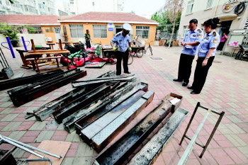 16日下午,在市南城管香港中路中队仓库大院,执法人员用铁锤销毁前期收缴的烧烤炉。据了解,自7月初以来,该中队在前海一线取缔了百余家露天烧烤商户,收缴烧烤炉、暂扣桌椅等物品300余件。为防止野烧烤摊“复燃”,执法人员对此类物品不予退还,当日下午全部进行销毁。