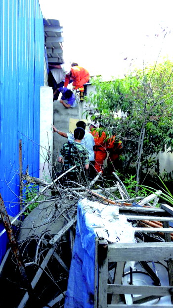 消防及公安人员正试图抢救触电者。本报记者 彭彦伟 摄