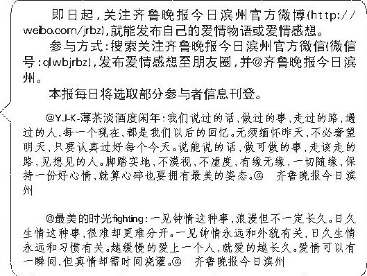 即日起,关注齐鲁晚报今日滨州官方微博(http://weibo.com/jrbz),就能发布自己的爱情物语或爱情感想。