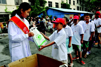 16日早上,参加齐鲁晚报2014首期“喜旺杯”小报童暑期营销秀活动的小报童们排队领取由漱玉平民大药房提供的“防暑礼包”。由于天气炎热,为保证小报童在卖报期间的身体健康,漱玉平民大药房专门为小报童每人准备了一份包括水杯、毛巾、防暑降温贴、藿香正气胶囊、花露水等防暑用品的爱心大礼包。