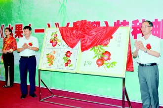 7月15日,中国邮政发行水果系列邮票的第一组,由枣庄市邮政公司和峄城区人民政府承办石榴邮票首发仪式。记者了解到,当人们欣赏这组邮票的同时,还能闻到阵阵水果香味,用手轻轻摩擦邮票后,味道会更加香浓,邮票欣赏起来也更有情趣。 本报见习记者 孟令洋 摄影报道