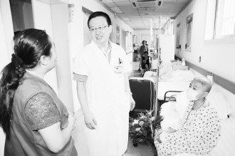 ◤在医院里,爱心人士向医生了解小文学的病情。