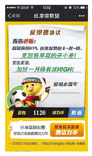 针对可能阻止球迷看球的“老婆、老板、老师、老妈”四个群体,蒙牛早餐奶成立了“反摩擦联盟”,在微信平台发起“反摩擦联盟拯救看球夜猫”的微信端互动活动,用户只要从官方微信进入早餐奶活动页面,选择汇报对象,并与其签署“反摩擦协议书”,当他们将此协议发给朋友或分享到朋友圈,他们的家人、老板、老师便会看到这个协议,进而理解球迷看球的心情。