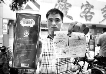 ◥刘先生向记者展示购买的过期白酒及小票。本报记者 李岩松 摄
