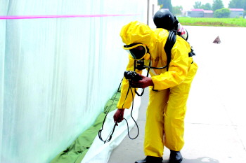 “即将出口西班牙的大蒜,在抽样中检出害虫,需要强制熏蒸杀虫。”17日,济宁检验检疫局针对熏蒸大蒜期间,有可能出现的气体泄漏,开展紧急救援演练。图为应急演练现场救援人员在测量泄露气体浓度。
