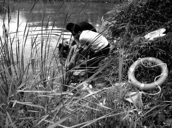 9日,太平镇横河村陵堂南的水坑边,有人要跳水自杀。平阳寺派出所民警赶到现场后,发现一老年妇女正在水坑中挣扎。民警徐永谦、队员陈士峰跳入水中,从落水妇女身后套上救生圈,将落水的妇女拖救到岸边。图为救人现场。