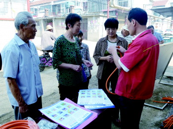 “安全生产月”期间,邹城市燃气总公司利用市民休闲娱乐时间,在城区3座广场集中开展安全宣传活动,提醒群众注意夏季用气安全。同时进社区讲解燃气安全常识。图为工作人员介绍检查燃气管道的方法。