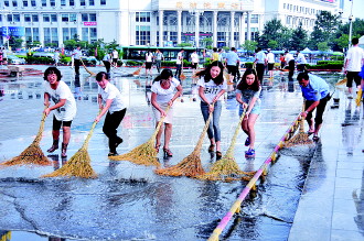 17日早,在威海豪业圣迪广场门口,近50名商场志愿者在广场周边清洁地面卫生,将部分油污的地面打扫干净。