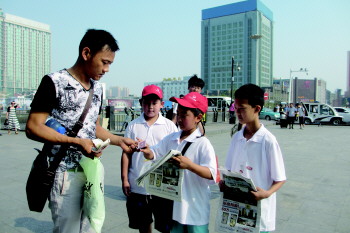 ◤任天佑、张城玮、尹岳琦三名小报童组团卖报。 本报记者 张童 摄