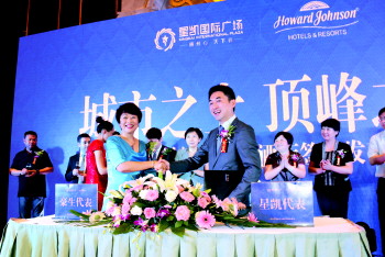 红星美凯龙发展中心总经理、德州星凯房地产开发有限公司董事长刘海斌与豪生国际酒店集团董事及大中华区业务发展资深副总裁杨惠玲签约。