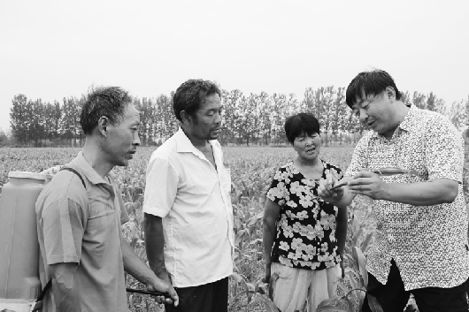 近日,李庄镇农技站的技术员为该镇李庄村的农民讲解二点委夜蛾的防治办法。二点委夜蛾是夏玉米产区新发生的害虫。李庄镇在做好二点委夜蛾发生动态监测工作的基础上,派出农技人员深入田间地头,指导农民科学防治,确保玉米丰产丰收。