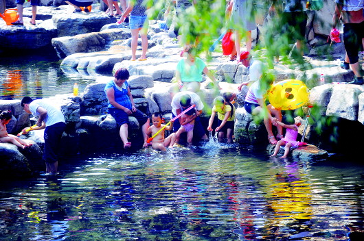 21日,雨后的济南高温难耐,不少市民带着孩子来到泉边享受清凉。 本报记者 左庆 摄