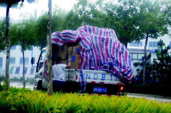 7月21日下午5时许,城区下起急雨,三八东路上的货车采取紧急遮雨措施。 本报记者 马志勇 摄