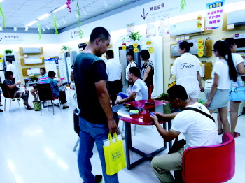 22日上午,记者走访了太白楼路上的几家家电商场,格力、美的、海尔等品牌空调店均爆棚,市民正在扎堆买空调。