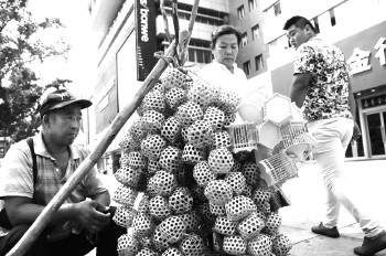 22日,南大街购物中心附近传来阵阵蝈蝈叫声,引得路人纷纷驻足。贩售蝈蝈的摊主说,这些蝈蝈“老家”在河北,它的叫声让很多人想起童年的美好时光。