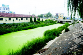 7月22日,在平原光明东街附近一条穿越工业区的水渠内,河水富营养化严重,水面飘满绿藻。