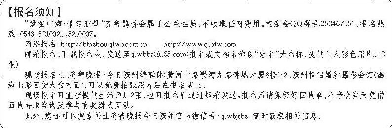 “爱在中海·情定航母”齐鲁鹊桥会属于公益性质,不收取任何费用。相亲会QQ群号:253467551。报名热线:0543-3210021、3210007。