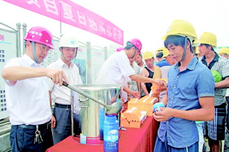 本报7月22日讯(记者 李孟霏) 22日上午,在中建五局山东分公司威海东方新天地项目部,项目部负责人对300多名坚守在生产一线的管理人员和农民工送去一份“清凉”。据了解,此次活动属于“超英廉洁文化进项目“活动一部分,活动资金也由“超英爱心基金“提供。
