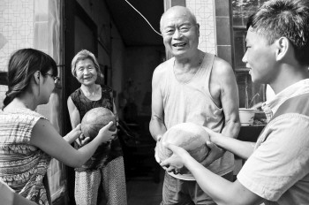 21日,聊城大学大学生志愿者来到聊城市古楼办事处米市街,给李西亮、马桂兰两位空巢老人送去了西瓜,让他们解暑,送去了夏日的清凉。 本报记者 李军 通讯员 赵玉国 李增聪 摄