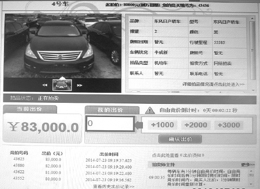 与传统现场拍卖形式不同的是,这次拍卖没有举牌、没有拍卖槌,而是网上公开进行,竞拍者全部在网络上限时竞价。23日,记者在中国拍卖行业协会网络拍卖平台看到,参与拍卖的公车照片显示在页面中间,竞拍者不显示姓名而是编号,根据500到1000、2000、3000不等的加价范围,竞拍者可以自由加价,也可以在“我的出价”一栏给予自己设定的价格。在“当前出价”一栏,会时不时跳出竞拍者给出的最高价,每款车有3分钟的自由竞价倒计时和1分钟的限时竞价。