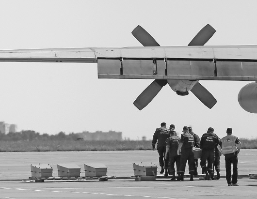 7月23日,在乌克兰哈尔科夫机场,人们将装有遇难者遗体的棺材放在飞机旁。