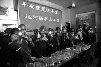 23日,济宁能源发展集团运河煤矿,工会、后勤科和女工家属协管员来到矿井口,为出入的职工递上甘甜可口的西瓜,为奋战在高温、露天、井下生产一线的职工送去一份夏日的清凉。 本报记者 马辉 通讯员 高维东 摄