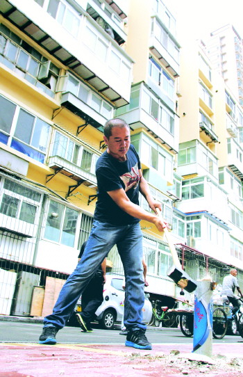23日,为维护公共利益、还道路于民,华茂物业联合向阳街道办、胜利路社区居委会、芝罘区城管大队、兴隆街派出所等多部门,打算清理小区内私设的地桩、地锁。上午8点半,华茂物业找来工人,开始拆除地桩、地锁。最先拆除的是胜利路社区居委会前的一排地桩,工人们将地桩用铁锤砸倒。