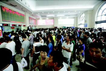 23日,排队买票的旅客挤满了青岛火车站售票大厅,场面如同春运。据了解,目前青岛发往北京、上海、济南等地的动车组和高铁车票特别紧俏,前往西宁、银川等方向列车卧铺票更是一票难求。