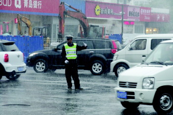 23日上午,市北交警在南京路辽阳西路路口冒雨疏导交通。 周衍鹏 摄