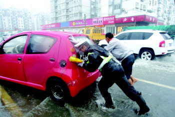 23日上午,市北交警辽源路副中队长李涌雨中推车。 周衍鹏 摄