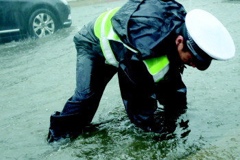 市北交警辽源路副中队长李涌雨中疏通下水道。 周衍鹏 摄
