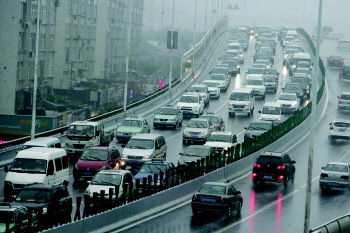 23日上午,受降雨影响,胶宁高架路堵车严重。