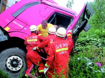 日照消防支队五莲大队12名官兵赶往处置,在现场发现一空集装箱大货车,车头落地,车尾部位倚在大桥上。驾驶室破损严重,一名司机被困。随后,消防队员破拆驾驶室,将司机救了出来,所幸司机并无大碍。