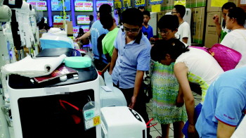 张店华光路一商场购买空调扇的市民挺多。